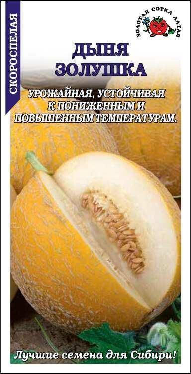 Сорт скороспелый (60-72 дня), урожайный, устойчив к пониженным и повышенным температурам. Растение плетистое. Плоды овальные, массой 1,1-2,2 кг, желтые, без рисунка, гладкие, со сплошной сеткой. Кора тонкая. Мякоть светло-кремовая, толщиной 3-3,5 см, хрустящая, сочная, нежная, очень сладкая и ароматная. Лежкость плодов 15-20 дней.