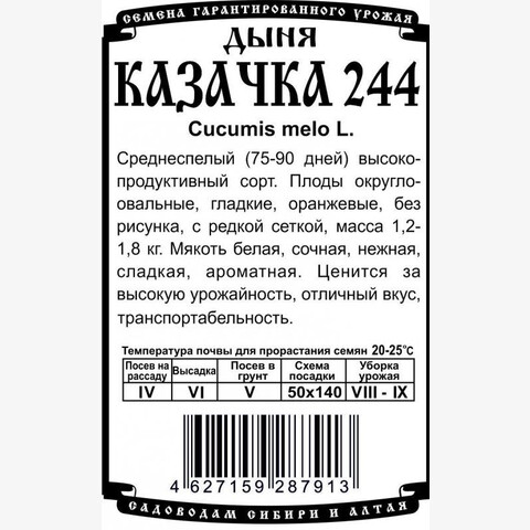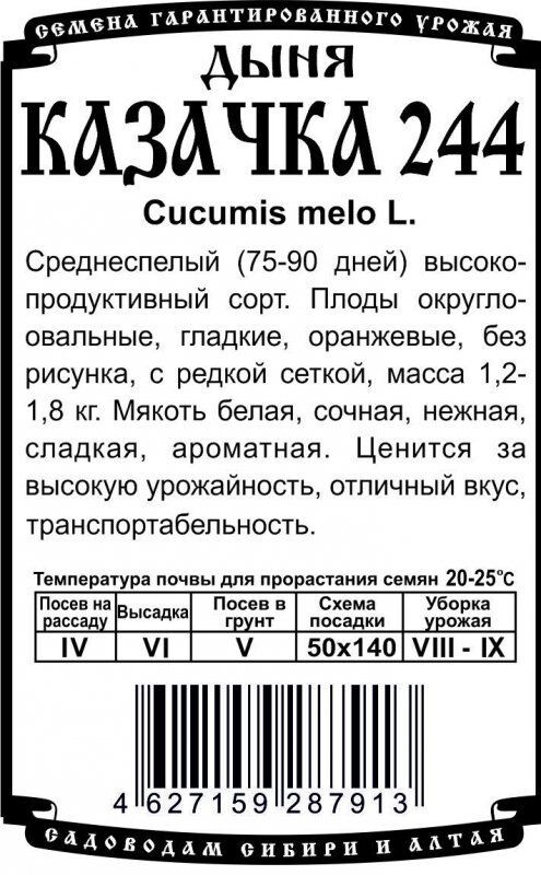 Среднеспелый (75-90 дней) высокопродуктивный сорт. Плоды округло-овальные, гладкие, оранжевые, без рисунка, с редкой сеткой, масса 1,2-1,8 кг. Мякоть белая, сочная, нежная, сладкая, ароматная. Ценится за высокую урожайность, отличный вкус, транспортабельность.