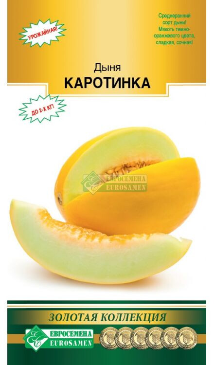 Дыня — не только вкусное лакомство, но ещё и кладезь витаминов и минералов, которые могут помочь восстановить полезные запасы человеческого организма. Каротинка- среднеранний сорт дыни, срок созревания около 70 дней. Растение плетистое, плоды овальной формы, желтого цвета, сегментированные, гладкие, со сплошной толстой сеткой, массой 1,3-2,0 кг. Мякоть темно-оранжевая, средней толщины, хрустящая, сочная, очень сладкая и ароматная. Сорт ценится за высокую урожайность и великолепные вкусовые качества, выращивание возможно как прямым посевом семян в грунт, так и через рассаду. При выращивании в открытом грунте растения прищипывают над 4-5 листом, оставляя 2-3 боковых побега и не более 4-5 плодов. При выращивании под пленочными укрытиями растения формируют в один стебель, подвязывают к шпалере. Для предотвращения порчи плодов от соприкосновения с землей, желательно подкладывать под них влагостойкий материал.