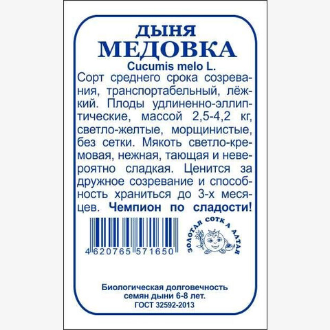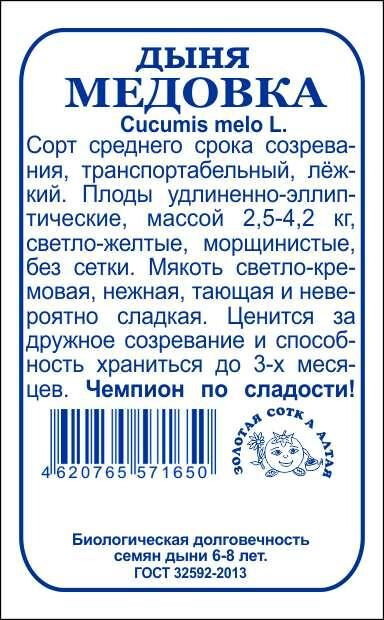 Сорт среднеспелый, транспортабельный и лёжкий, созревает дружно, способен храниться до 3-х месяцев без потери товарных и вкусовых качеств. Плоды удлиненно-эллиптические, светло-желтые, массой 2,5-4,2 кг, морщинистые, без сетки. Мякоть светло-кремовая, средней толщины, тающая, нежная и очень сладкая.