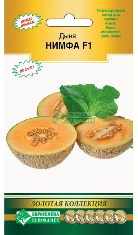 Дыня — не только вкусное лакомство, но ещё и кладезь витаминов и минералов, которые могут помочь восстановить полезные запасы человеческого организма. Нимфа- ультраскороспелый гибрид дыни (сортотип Ананас). В плодоношение вступает на 75-80 день от полных всходов. Растение мощное, сильное. Плоды порционные, эллипсовидной формы, желтого цвета, с плотной белой сеткой на коре. Масса плодов — 1,5-2,0 кг. Мякоть красивого абрикосового цвета, очень сочная, сладкая, приятной, слегка хрустящей консистенции и ярким ананасовым ароматом. Кожура очень тонкая, как у яблока, семенная камера маленькая. Гибрид устойчив к фузариозному увяданию, мучнистой росе. Транспортабельность и лежкость плодов хорошие. Рекомендуется для выращивания в открытом и защищенном грунте, плотность посадки — не более 2 растений/м².
