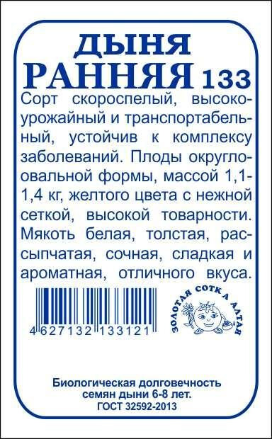 Сорт скороспелый, высокоурожайный и транспортабельный. Плоды округло-овальной формы, массой 1,1-1,4 кг, желтые, с выраженной шероховатой сеткой. Мякоть белого цвета, толстая, рассыпчатая, сочная, сладкая и ароматная. Сорт устойчив к комплексу заболеваний, характеризуется высокими товарными и вкусовыми качествами.