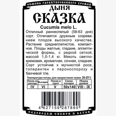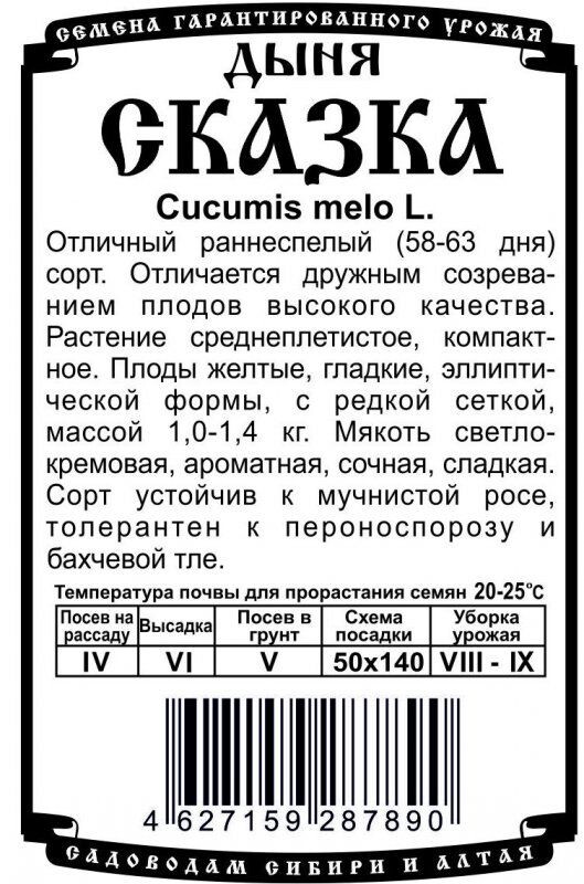 Отличный раннеспелый (58-63 дня) сорт. Отличается дружным созреванием плодов высокого качества. Растение среднеплетистое, компактное. Плоды желтые, гладкие, эллиптической формы, с редкой сеткой у плодоножки, массой 1,0-1,4 кг. Мякоть светло-кремовая, ароматная, сочная, сладкая. Сорт устойчив к мучнистой росе, толерантен к пероноспорозу и бахчевой тле.