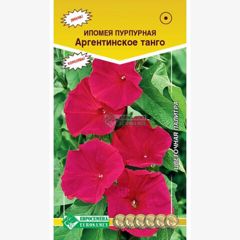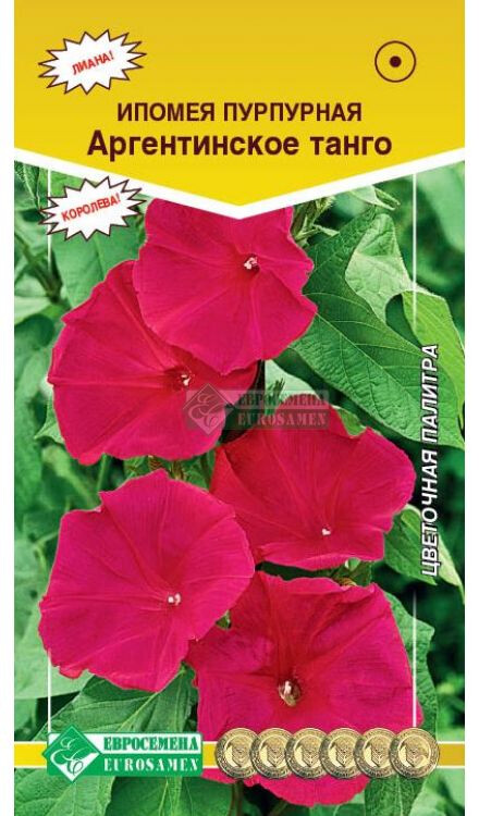 Садоводам, использующим в ландшафтном дизайне вертикальное озеленение, ипомея придется как нельзя кстати. Эта цветущая лиана густо обвивает опоры и даже при отсутствии бутонов смотрится очень декоративно за счет густой листвы. Цветки ипомеи выглядят как нежные воронкообразные граммофончики, напоминающие симбиоз настурции и душистого табака. Это однолетнее вьющееся растение из семейства Вьюнковых. Его родина – Мексика и тропическая Америка. Как лиана ипомея исключительно востребована, применение в дизайне сада самое широкое. Это растение беседок, решеток, заборов, столбов, больших деревьев. Ее можно подсаживать к дикому винограду, и тогда плотная стена из него оживляется нежными цветами. На каждый квадратный метр их насчитывается около ста! Аргентинское танго - уникальная вьющаяся лиана с красивыми листьями и нарядными цветками ярко-красного цвета, выглядит очень эффектно. Цветки остаются открытыми значительно дольше, чем у известных сортов, кокетливо выглядывают из-за воздушной и очень красивой листвы. Растение способно взобраться по любой опоре и соткать на ней живой ковер удивительной красоты. Высота растения-200 см Диаметр цветка-5 см