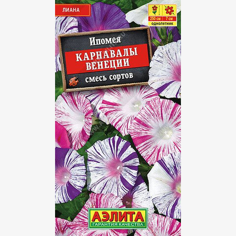 Быстрорастущая лиана с эффектным и пышным цветением. Изюминка сорта – редкая контрастная окраска венчика. Побеги гибкие, прочные, длиной до 250 см, обильно усыпаны цветками Ø 6-7 см. Растения создают роскошный пестрый ковер в вертикальной плоскости на любой опоре. Идеальны для декорирования балконов, оград, стен и беседок.
