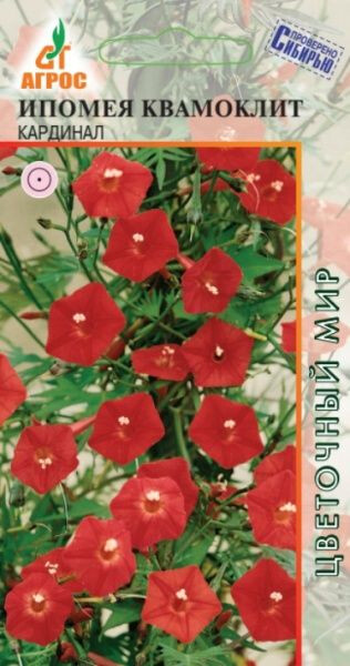 Однолетнее вьющееся травянистое, быстрорастущее растение. Ярко-зеленые листья напоминают папоротник. Цветки многочисленные звездчатые, диаметром 2-3 см, венчики карминово-красные. Замоченные за сутки в воде семена, высевают сразу в открытый грунт во второй половине мая или на рассаду в конце апреля. Всходы появляются через 7-10 дней. Слишком рано сеять семена на рассаду нежелательно, так как растения быстро растут, свиваясь между собой, и к моменту высадки их бывает очень сложно разделить. Ипомея теплолюбива, относительно не требовательна к почвам. Для посадки лучше выбрать солнечное, открытое место с южной или западной стороны дома или беседки. В сухой период растениям необходим полив. До цветения можно сделать 2-3 подкормки комплексным минеральным удобрением. Используют для вертикального оформления стен, балконов, террас, беседок, пергол, арок и цветников различного назначения. 250-300 IV V V-VI 50x50 VII-IX