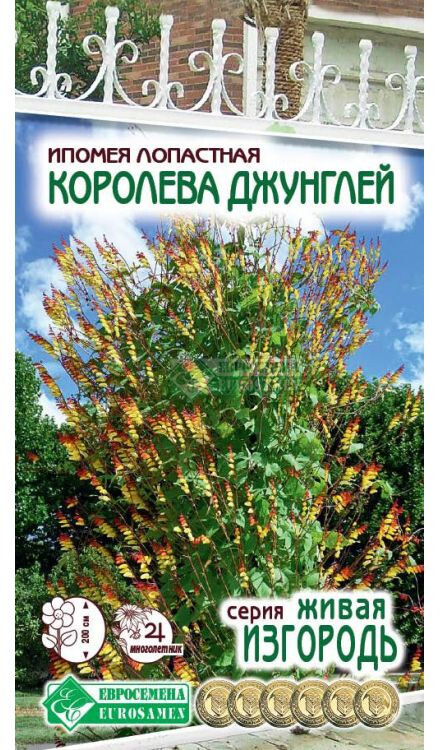 Королева Джунглей - необычная травянистая многолетняя лиана родом из Мексики, культивируемая как однолетник в средней полосе России, относится к роду Ипомея, объединяющему около 300 видов. Она притягивает взоры своим ярким убранством и экзотичностью, и не похожа ни на какое другое вьющееся растение. Королева Джунглей - идеальное растение для тех, кто любит экзотические культуры, она удивит и порадует необычными цветами и сочной зеленью, задекорирует невзрачные стены, укроет от непрошенных, любопытных взглядов прохожих, затенит место отдыха или озеленит балкон. Такое растение легко украсит сад вашей мечты. На фоне темно-зеленых лопастных листьев, словно всполохи яркого пламени, светятся оригинальные соцветия. Красота ипомеи в том, что одновременно на растении присутствуют, и начинающие только цвести и уже доцветающие соцветия. Бутоны темно-красного цвета, но по мере распускания цветков их окраска меняется от оранжевой до кремово-белой. Создается впечатление, будто стайка тропических попугайчиков рассыпалась в густой зелени.
