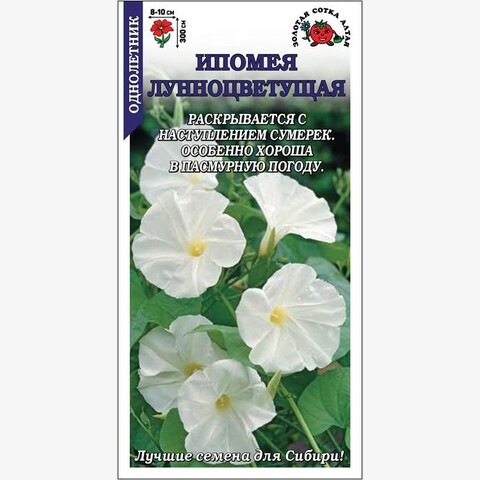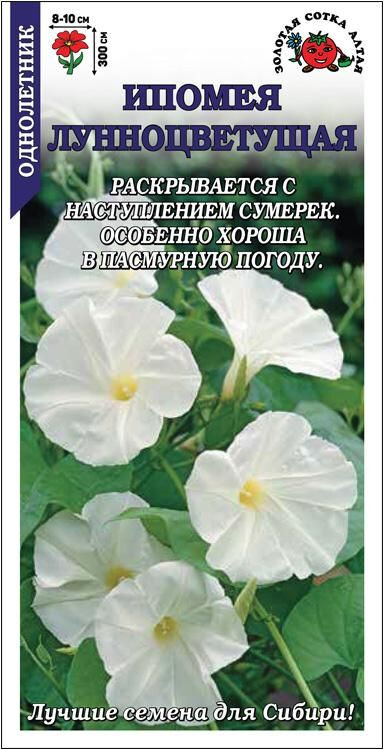 Быстрорастущее растение для вертикального озеленения в саду и на балконе. Крупные сердцевидные листья ярко-зеленого цвета создают водо- и светонепроницаемую завесу, обеспечивающую прохладой в жаркий день искрывающую Вас от посторонних глаз. Белые ароматные цветы, как волшебные фонарики, включаются с наступлением сумерек и сияют до восхода солнца. В пасмурную погоду растение цветет весь день.
