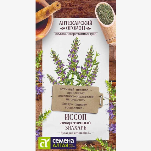 Травянистый многолетник. Популярное пряно-ароматическое и лекарственное растение, хороший медонос. Высота - 40-60 см. Листья и молодые побеги используют в свежем и сушеном виде в качестве приправы к разнообразным блюдам, а в лекарственных целях заготавливают цветки и верхние травянистые части во время цветения. Эфирное масло иссопа обладает антимикробным и противовирусным действием, используется при заболеваниях верхних дыхательных путей, желудочно-кишечного тракта, ревматизме. Ценится за приятный интенсивный аромат, высокую декоративность, лекарственные, медоносные и пищевые качества. Место посадки: нетребователен к почвам Освещение: обильное, выносит затенение Предпосевная подготовка: для более дружных всходов рекомендуется стратификация в течение 3-4 недель Сроки посева: на рассаду высевают в первой декаде марта, в открытый грунт в апреле-мае, под зиму в октябре-ноябре Посев на рассаду: глубина заделки семян 0,6-1 см. Ящики с посевами накрывают пленкой или пластиковой крышкой и убирают в теплое место. При температуре +22…24°С всходы появляются в течение 10-12 дней Посев в грунт: когда почва прогреется до +10…15°С, глубина заделки семян 0,6-1 см по схеме 40x60 см. Необходимо прикрыть укрывным материалом до появления всходов, чтобы предотвратить пересыхание почвы. В открытом грунте всходы появляются в течение двух недель. Под зиму сеется в рыхлый грунт (в зависимости от региона) Пикировка/перевалка: при появлении 5-6-го листа сеянцы пересаживают на постоянное место по схеме 40x60 см Уход: заключается в прополке, рыхлении междурядий, поливе при необходимости, подкормке. Взрослый иссоп может расти на одном месте 5-7 лет. В дальнейшем кустам необходимо деление и пересадка на новое место Сбор урожая: сбор сырья начинают в начале цветения со второго года роста растения. Цветёт ближе ко второй половине лета. Верхушечную часть стеблей с цветами и листья используют в свежем и сушёном виде. Срезают их длиной около 20 см и сушат под навесом