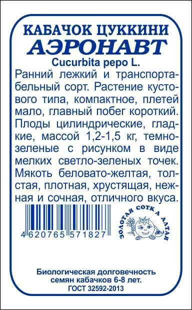Раннеспелый лежкий и транспортабельный сорт. От полных всходов до первого сбора около 46 дней. Растение кустовое, компактное, плетей мало, главный побег короткий. Плоды цилиндрической формы, массой 1,2-1,5 кг, темно-зеленые с рисунком в виде мелких светло-зеленых точек, гладкие. Мякоть беловато-желтая, толстая, хрустящая, плотная, нежная и сочная, отличного вкуса. Используют в кулинарии и для переработки.