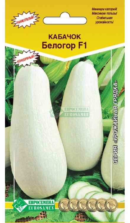 Согласно легенде, кабачки подарил людям Бог. Давным-давно женщины рыбацкой деревни, проводив своих мужей в море, обратились к Богу с молитвой подарить им плод, мякоть которого был бы как у рыбы, цвет - как у моря в лунную ночь, а кожура такая же, как панцирь черепахи. В ответ на их мольбу Бог подарил им кабачок. С тех пор кабачки - частые гости за столом у тех, кто следит за своей фигурой и соблюдает диетическое питание. Белогор- раннеспелый, высокоурожайный гибрид. Период от всходов до начала плодоношения 42-45 дней. Плод цилиндрический, поверхность гладкая, зеленовато-белый, сетки нет, рисунок отсутствует. Масса плодов 0,5-1 кг. Кора тонкая, деревянистая. Мякоть белая, плотная, нежная, несладкая, малосочная. Ценится за урожайность, хороший вкус переработанной продукции, используется для консервирования и приготовления кабачковой икры. В кабачках много яблочной кислоты, калия, кальция и фосфора, глюкозы, фруктозы и сахарозы, что способствует выведению воды и поваренной соли.