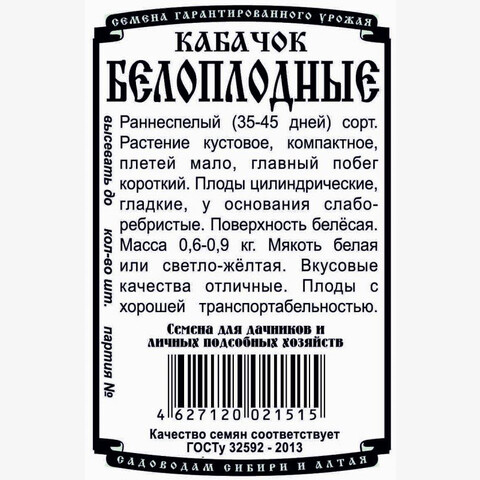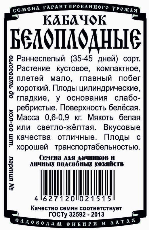 Раннеспелый (35-45 дней) сорт. Растение кустовое, компактное, плетей мало, главный побег короткий. Плоды цилиндрические, гладкие, у основания слаборебристые. Поверхность белёсая. Масса 0,6-0,9 кг. Мякоть белая или светло-жёлтая. Вкусовые качества отличные. Плоды с хорошей транспортабельностью.
