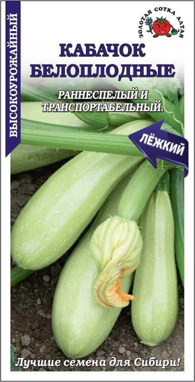 Раннеспелый высокоурожайный сорт. От массовых всходов до технической спелости 36-44 дня. Растение кустовое, с большим количеством женских цветков. Листья темно-зеленые, с белой пятнистостью. Плоды цилиндрические, гладкие, массой 0,8-1,0 кг, в технической спелости белесовато-белые. Мякоть белая или светло-кремовая, средней плотности, сочная, отличного вкуса. Сорт используется для жарки, тушения, приготовления икры и маринования. Транспортабельность и лежкость хорошие.