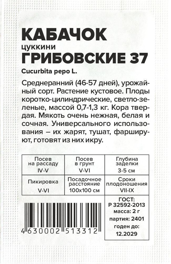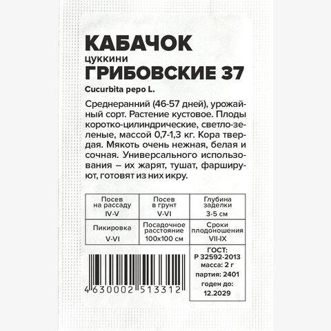 Среднеранний (46-57 дней), урожайный сорт. Растение кустовое. Плоды коротко-цилиндрические, светло-зеленые, массой 0,7-1,3 кг. Кора твердая. Мякоть очень нежная, белая и сочная. Универсального использования — их жарят, тушат, фаршируют, готовят из них икру. Кабачки очень хорошо усваиваются организмом, являются диетическим продуктом. Место посадки: легкие плодородные нейтральные почвы. Лучшими предшественниками являются крестоцветные (разные виды капусты), пасленовые Освещение: освещенные участки, хорошо переносят затенение Предпосевная подготовка: не требуется. Для улучшения всхожести выбирают семена возрастом 3-5 лет, замачивают в 1% растворе марганцовки на 15 минут Сроки посева: при прогревании почвы до 12-15°C. Растение не переносит заморозков Посев на рассаду: для получения ранней продукции кабачки сеют на рассаду поздней весной, за две-три недели до высадки. Посев в грунт: посев проводят, когда почва прогреется до 10-12°C (апрель-июнь). В лунку насыпают перегной, который немного присыпают землей, укладывают 2-3 семени и засыпают торфоземляной смесью. Схема посадки 100х100 см, глубина заделки семян 3-5 см. При раннем посеве в открытый грунт необходимо временное укрытие пленкой Пикировка/перевалка: рассаду закаливают, высадку проводят при среднесуточной температуре не ниже 15°C. Растения высаживают без повреждения земляного кома на высоту корневой шейки, без заглубления. Первые 3-5 дней притеняют Уход: для получения наиболее высокого урожая рекомендуется регулярно проводить рыхление почвы и умеренные поливы. В период цветения-налива плодов рекомендуется провести подкормку комплексными минеральными удобрениями. Не требует формировки Сбор урожая: проводится выборочно, по мере достижения плодами технической зрелости