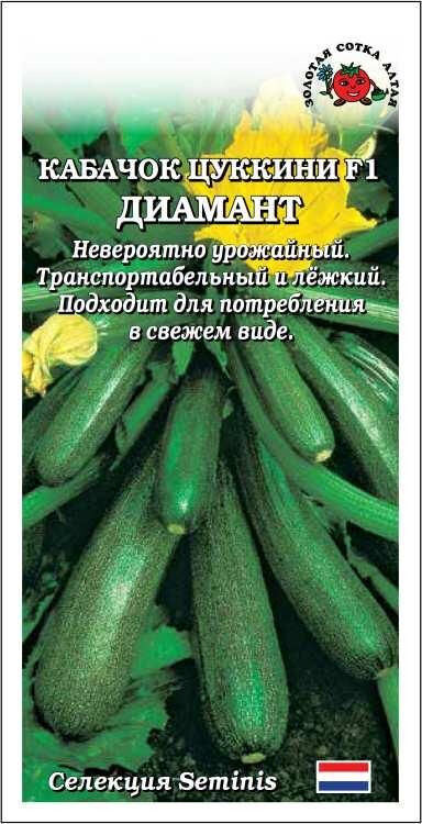Гибрид ранний (40-47 дней), невероятно урожайный, транспортабельный и лёжкий, вынослив к переувлажнению и пониженным температурам. Растение полуплетистое, компактное, дает до20 плодов с куста. Плоды изогнуто-цилиндрические, ребристые, массой 0,6-0,9 кг, темно-зеленые с белым крапом. Семена мелкие, слаборазвитые. Мякоть белая, плотная, нежная, великолепного вкуса. Используют в кулинарии, для приготовления икры и маринования, молодые завязи в свежем виде добавляют в салаты.
