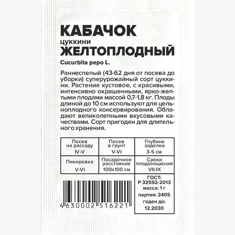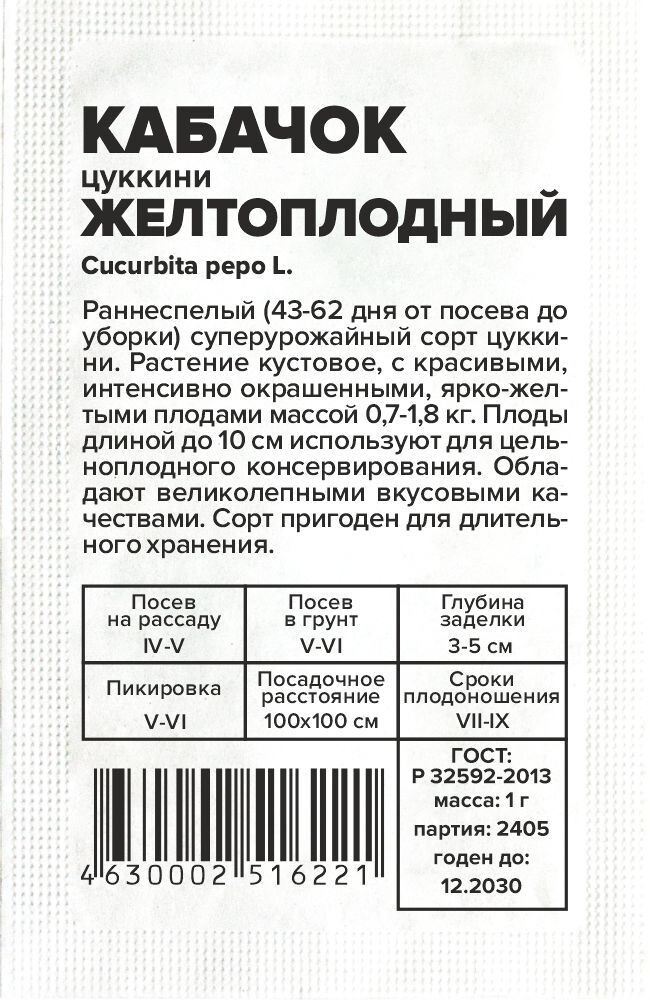 Раннеспелый (43-62 дня от посева до уборки) суперурожайный сорт цуккини. Растение кустовое, с красивыми, интенсивно окрашенными, ярко-желтыми плодами массой 0,7-1,8 кг. Плоды длиной до 10 см используют для цельноплодного консервирования. Обладают великолепными вкусовыми качествами. Сорт пригоден для длительного хранения. Место посадки: легкие плодородные нейтральные почвы. Лучшими предшественниками являются крестоцветные (разные виды капусты), пасленовые Освещение: освещенные участки, хорошо переносят затенение Предпосевная подготовка: не требуется. Для улучшения всхожести выбирают семена возрастом 3-5 лет, замачивают в 1% растворе марганцовки на 15 минут Сроки посева: при прогревании почвы до 12-15°C. Растение не переносит заморозков Посев на рассаду: для получения ранней продукции кабачки сеют на рассаду поздней весной, за две-три недели до высадки. Посев в грунт: посев проводят, когда почва прогреется до 10-12°C (апрель-июнь). В лунку насыпают перегной, который немного присыпают землей, укладывают 2-3 семени и засыпают торфоземляной смесью. Схема посадки 100х100 см, глубина заделки семян 3-5 см. При раннем посеве в открытый грунт необходимо временное укрытие пленкой Пикировка/перевалка: рассаду закаливают, высадку проводят при среднесуточной температуре не ниже 15°C. Растения высаживают без повреждения земляного кома на высоту корневой шейки, без заглубления. Первые 3-5 дней притеняют Уход: для получения наиболее высокого урожая рекомендуется регулярно проводить рыхление почвы и умеренные поливы. В период цветения-налива плодов рекомендуется провести подкормку комплексными минеральными удобрениями. Не требует формировки Сбор урожая: проводится выборочно, по мере достижения плодами технической зрелости