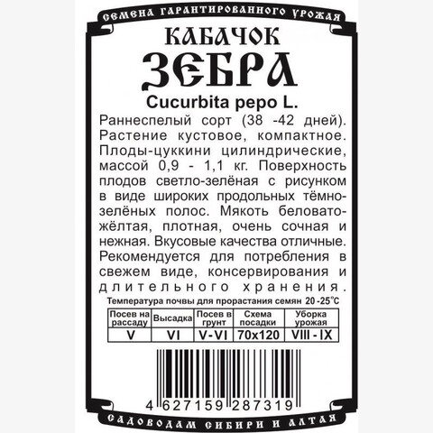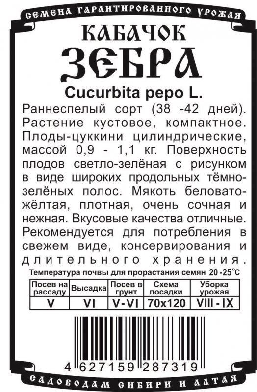Раннеспелый сорт (период от полных всходов до первого сбора 38 дней). Растение кустовое, компактное. Плод цилиндрический, масса товарного плода 0,9-1,0 кг. Поверхность плода светло-зелёная, рисунок в виде широких продольных тёмно-зелёных полос. Мякоть беловато-жёлтая, плотная. Вкусовые качества хорошие (мякоть нежная, сочная). Товарная урожайность 9,0 кг/м2. Рекомендуется для столовых целей (употребления в свежем виде и консервирования).