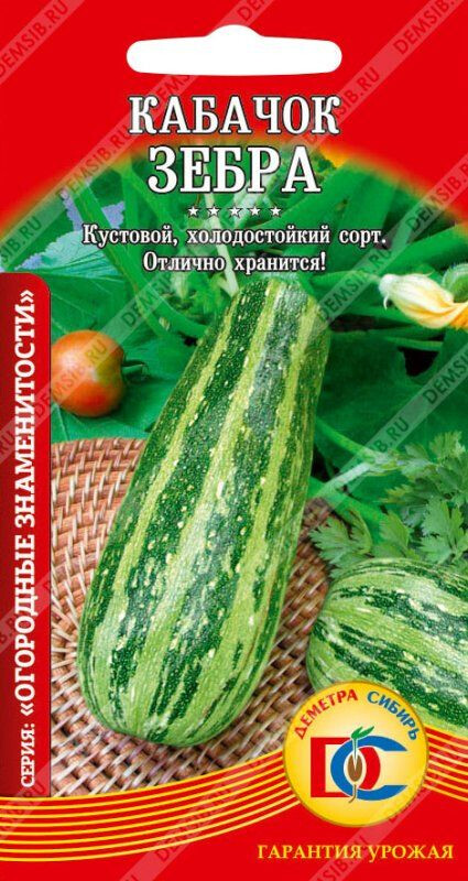 Раннеспелый сорт (период от полных всходов до первого сбора 38 дней). Растение кустовое, компактное. Плод цилиндрический, масса товарного плода 0,9 - 1,0 кг. Поверхность плода светло-зелёная, рисунок в виде широких продольных тёмно-зелёных полос. Мякоть беловато-жёлтая, плотная. Вкусовые качества хорошие (мякоть нежная, сочная). Товарная урожайность 9,0 кг/м2. Рекомендуется для столовых целей (употребления в свежем виде и консервирования).
