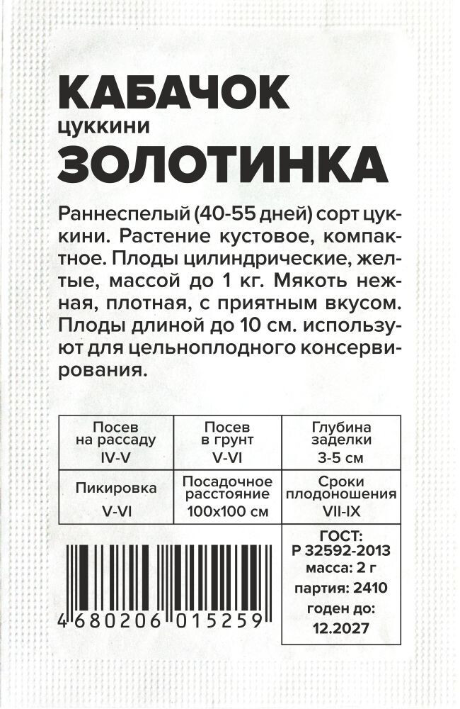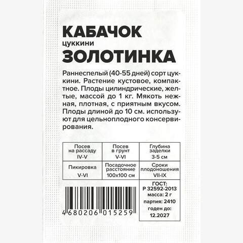 Раннеспелый (40-55 дней) сорт цуккини. Растение кустовое, компактное. Плоды цилиндрические, желтые, массой до 1 кг. Мякоть нежная, плотная, с приятным вкусом. Плоды длиной до 10 см. используют для цельноплодного консервирования. Место посадки: легкие плодородные нейтральные почвы. Лучшими предшественниками являются крестоцветные (разные виды капусты), пасленовые Освещение: освещенные участки, хорошо переносят затенение Предпосевная подготовка: не требуется. Для улучшения всхожести выбирают семена возрастом 3-5 лет, замачивают в 1% растворе марганцовки на 15 минут Сроки посева: при прогревании почвы до 12-15°C. Растение не переносит заморозков Посев на рассаду: для получения ранней продукции кабачки сеют на рассаду поздней весной, за две-три недели до высадки. Посев в грунт: посев проводят, когда почва прогреется до 10-12°C (апрель-июнь). В лунку насыпают перегной, который немного присыпают землей, укладывают 2-3 семени и засыпают торфоземляной смесью. Схема посадки 100х100 см, глубина заделки семян 3-5 см. При раннем посеве в открытый грунт необходимо временное укрытие пленкой Пикировка/перевалка: рассаду закаливают, высадку проводят при среднесуточной температуре не ниже 15°C. Растения высаживают без повреждения земляного кома на высоту корневой шейки, без заглубления. Первые 3-5 дней притеняют Уход: для получения наиболее высокого урожая рекомендуется регулярно проводить рыхление почвы и умеренные поливы. В период цветения-налива плодов рекомендуется провести подкормку комплексными минеральными удобрениями. Не требует формировки Сбор урожая: проводится выборочно, по мере достижения плодами технической зрелости