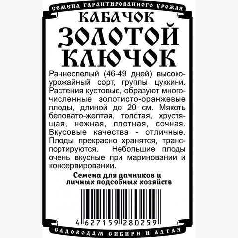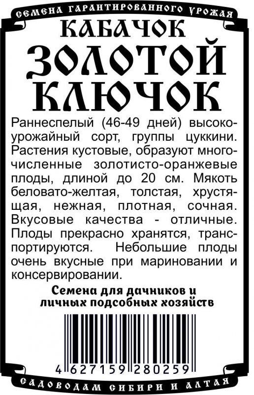 Раннеспелый (46-49 дней) высокоурожайный сорт, группы цуккини. Растения кустовые, образуют многочисленные золотисто-оранжевые плоды, длиной до 20 см. Мякоть беловато-желтая, толстая, хрустящая, нежная, плотная, сочная. Вкусовые качества - отличные. Плоды прекрасно хранятся, транспортируются. Небольшие плоды очень вкусные при мариновании и консервировании.