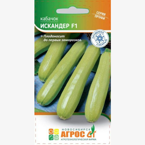 Суперранний, чрезвычайно продуктивный гибрид кустового типа. На компактном растении образуются плоды цилиндрической формы, длиной 18-20 см. Окраска плодов светло-зеленая, мякоть белая. ИСКАНДЕР F1 плодоносит до первых заморозков. Рекомендуется для выращивания в открытом грунте, применяя временные пленочные укрытия, можно получать сверхраннюю продукцию.