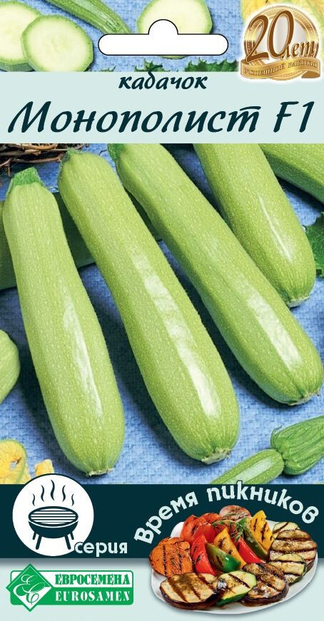 Овощи на гриле, а также овощной шашлык — здоровая альтернатива блюдам из жареных продуктов, их можно подать в качестве закуски или гарнира, из них получается прекрасный салат — теплый или холодный. Овощная серия Время Пикников разработана специально для осуществления этих целей и включает сорта и гибриды овощей с малым количеством влаги и семечек. Кабачок Монополист F1- ранний гибрид кабачка (35-40 дней от всходов до начала плодоношения). Плоды цилиндрические, длиной 16-22 см, диаметром 4-7 см, массой 300-350 г, гладкие, светло-зеленые. Кожица блестящая, глянцевая. Мякоть белая, отличной консистенции. Рекомендуется для выращивания в открытом грунте и под временными укрытиями. Назначение универсальное.