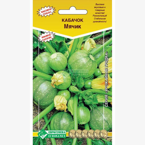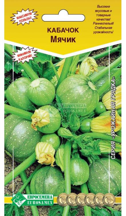 Согласно легенде, кабачки подарил людям Бог. Давным-давно женщины рыбацкой деревни, проводив своих мужей в море, обратились к Богу с молитвой подарить им плод, мякоть которого был бы как у рыбы, цвет - как у моря в лунную ночь, а кожура такая же, как панцирь черепахи. В ответ на их мольбу Бог подарил им кабачок. С тех пор кабачки - частые гости за столом у тех, кто следит за своей фигурой и соблюдает диетическое питание. Мячик- раннеспелый, сорт, период от всходов до начала плодоношения 50-55 дней. Растение кустовое, ветвление среднее. Плод шаровидный, у основания слаборебристый, окраска зеленая с мелкими светло-зелеными точками. Масса плода 0,8-2,1 кг. Великолепно подходит для фаршировки, для этой цели используют плоды массой 90-150 г. Плоды отличаются превосходными вкусовыми качествами. В кабачках много яблочной кислоты, калия, кальция и фосфора, глюкозы, фруктозы и сахарозы, что способствует выведению воды и поваренной соли.