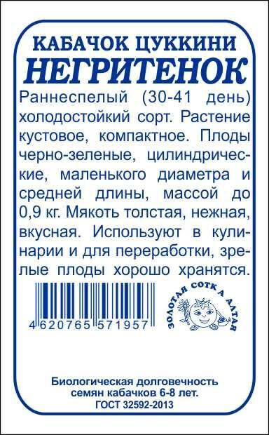 Раннеспелый холодостойкий сорт. От всходов до технической спелости 30-41 день. Растение кустовое, компактное. Плоды цилиндрические, темно-зеленой (почти черной) окраски, массой 0,7-0,9 кг. Мякоть толстая, сочная, нежная, обладает отличным вкусом. Используют в кулинарии и для переработки, зрелые плоды хорошо хранятся.