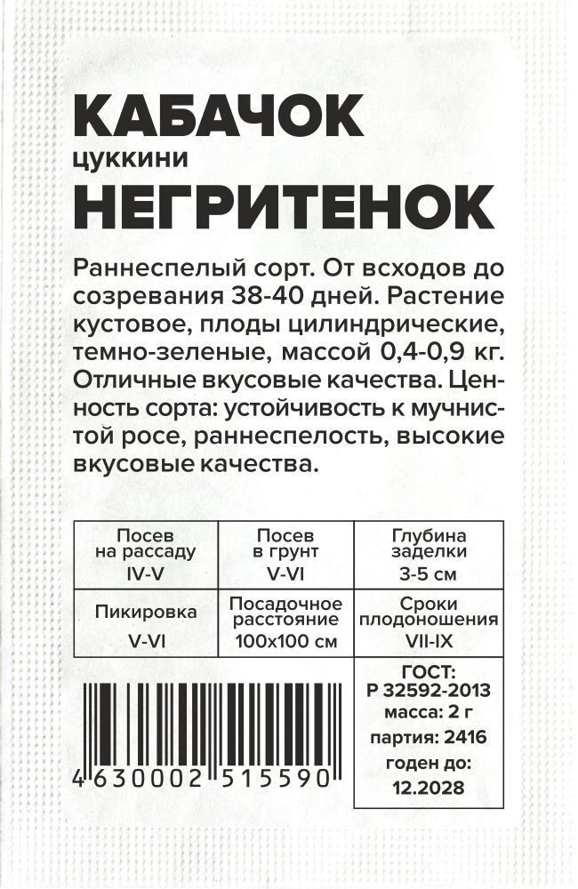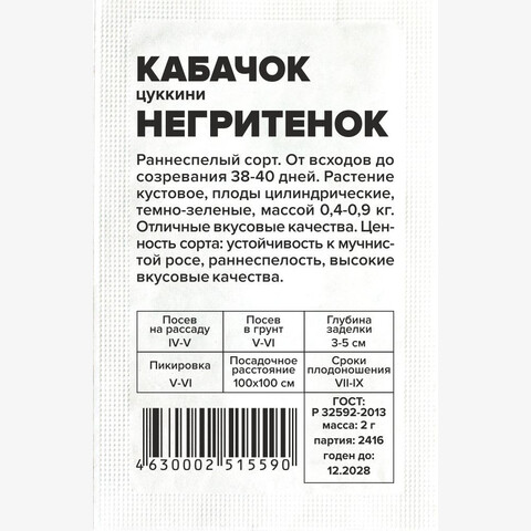 Раннеспелый сорт. От всходов до созревания 38-40 дней. Растение кустовое, плоды цилиндрические, темно-зеленые, массой 0,4-0,9 кг. Отличные вкусовые качества. Ценность сорта: устойчивость к мучнистой росе, раннеспелость, высокие вкусовые качества. Место посадки: легкие плодородные нейтральные почвы. Лучшими предшественниками являются крестоцветные (разные виды капусты), пасленовые Освещение: освещенные участки, хорошо переносят затенение Предпосевная подготовка: не требуется. Для улучшения всхожести выбирают семена возрастом 3-5 лет, замачивают в 1% растворе марганцовки на 15 минут Сроки посева: при прогревании почвы до 12-15°C. Растение не переносит заморозков Посев на рассаду: для получения ранней продукции кабачки сеют на рассаду поздней весной, за две-три недели до высадки. Посев в грунт: посев проводят, когда почва прогреется до 10-12°C (апрель-июнь). В лунку насыпают перегной, который немного присыпают землей, укладывают 2-3 семени и засыпают торфоземляной смесью. Схема посадки 100х100 см, глубина заделки семян 3-5 см. При раннем посеве в открытый грунт необходимо временное укрытие пленкой Пикировка/перевалка: рассаду закаливают, высадку проводят при среднесуточной температуре не ниже 15°C. Растения высаживают без повреждения земляного кома на высоту корневой шейки, без заглубления. Первые 3-5 дней притеняют Уход: для получения наиболее высокого урожая рекомендуется регулярно проводить рыхление почвы и умеренные поливы. В период цветения-налива плодов рекомендуется провести подкормку комплексными минеральными удобрениями. Не требует формировки Сбор урожая: проводится выборочно, по мере достижения плодами технической зрелости