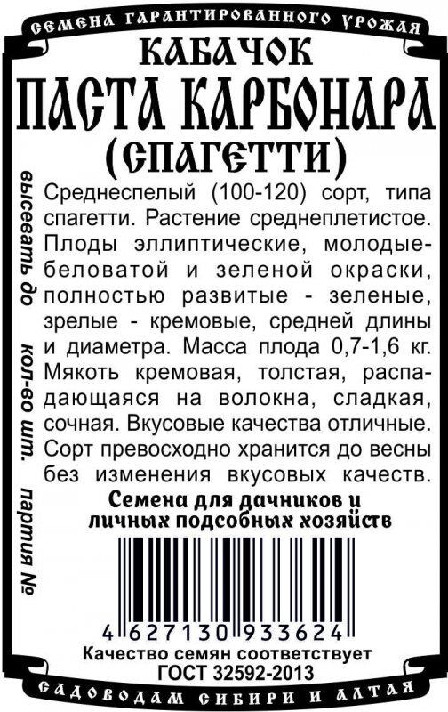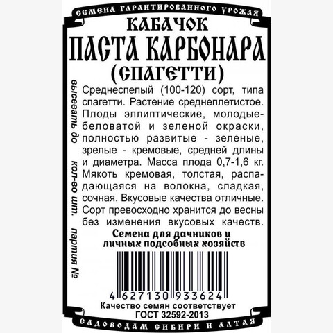 Среднеспелый (100-120 дней) сорт, типа спагетти. Растение среднеплетистое. Плоды эллиптические, молодые плоды беловатой и зеленой окраски, полностью развитые - зеленые, зрелые - кремовые, средней длины и диаметра. Масса плода 0,7-1,6 кг. Мякоть кремовая, толстая, распадающаяся на волокна, сладкая, сочная. Вкусовые качества отличные. Сорт превосходно хранится до весны без изменения вкусовых качеств.