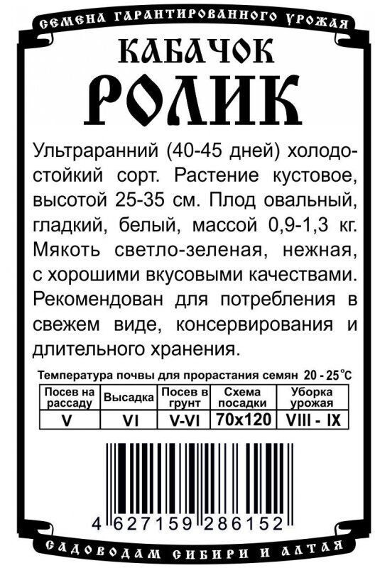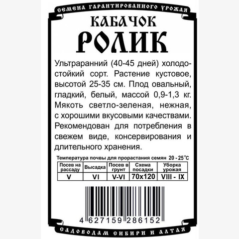 Ультраранний (40-45 дней) холодостойкий сорт. Растение кустовое, высотой 25-35 см. Плод овальный, гладкий, белый, массой 0,9-1,3 кг. Мякоть светло-зеленая, нежная, с хорошими вкусовыми качествами. Рекомендован для потребления в свежем виде, консервирования и длительного хранения