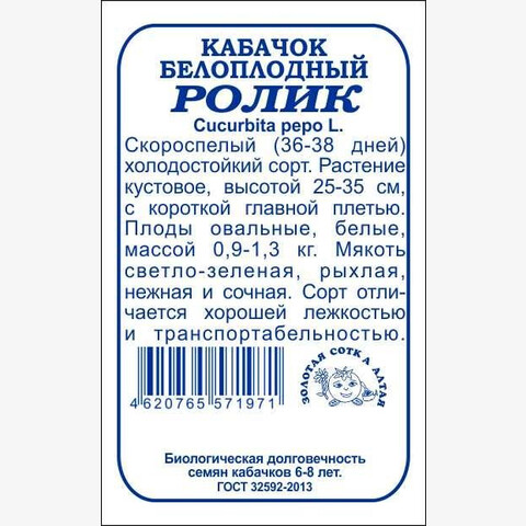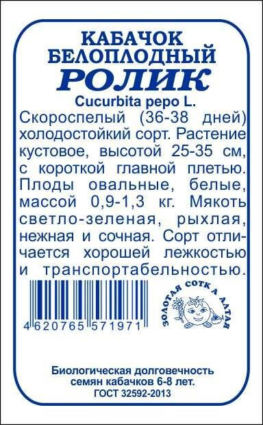 Скороспелый ( 36-38 дней) холодостойкий сорт. Растение кустовое, высотой 25-35 см, с короткой главной плетью. Плоды овальные, белые, массой 0,9-1,3 кг. Мякоть светло-зеленая, рыхлая, нежная и сочная. Сорт отличается хорошей лежкостью и транспортабельностью.