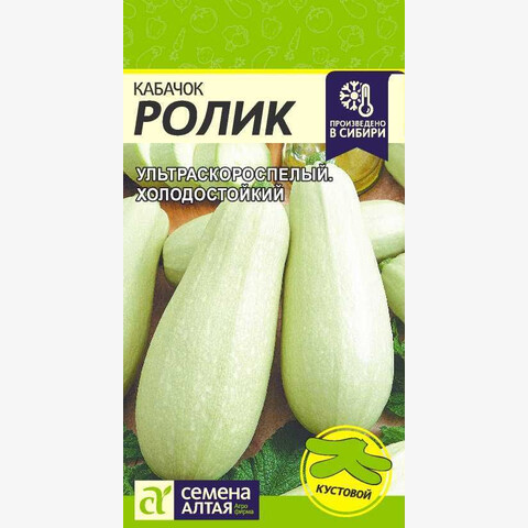 Ультраскороспелый сорт. Растение кустовое, высотой 25-30 см. Плод овальный, гладкий, массой 0,9-1,3 кг, без сетки и рисунка. Мякоть светло-зеленая, рыхлая, нежная, сочная. Одновременно формирует 3-5 плодов. Сорт устойчив к пониженным температурам, слабо поражается серой гнилью. Рекомендуется для выращивания в открытом грунте. Место посадки: легкие плодородные нейтральные почвы. Лучшими предшественниками являются крестоцветные (разные виды капусты), пасленовые Освещение: освещенные участки, хорошо переносят затенение Предпосевная подготовка: не требуется. Для улучшения всхожести выбирают семена возрастом 3-5 лет, замачивают в 1% растворе марганцовки на 15 минут Сроки посева: при прогревании почвы до 12-15°C. Растение не переносит заморозков Посев на рассаду: для получения ранней продукции кабачки сеют на рассаду поздней весной, за две-три недели до высадки. Посев в грунт: посев проводят, когда почва прогреется до 10-12°C (апрель-июнь). В лунку насыпают перегной, который немного присыпают землей, укладывают 2-3 семени и засыпают торфоземляной смесью. Схема посадки 100х100 см, глубина заделки семян 3-5 см. При раннем посеве в открытый грунт необходимо временное укрытие пленкой Пикировка/перевалка: рассаду закаливают, высадку проводят при среднесуточной температуре не ниже 15°C. Растения высаживают без повреждения земляного кома на высоту корневой шейки, без заглубления. Первые 3-5 дней притеняют Уход: для получения наиболее высокого урожая рекомендуется регулярно проводить рыхление почвы и умеренные поливы. В период цветения-налива плодов рекомендуется провести подкормку комплексными минеральными удобрениями. Не требует формировки Сбор урожая: проводится выборочно, по мере достижения плодами технической зрелости