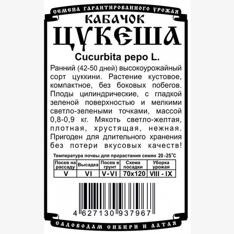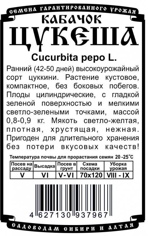Ранний (42-50 дней) высокоурожайный сорт цуккини. Растение кустовое, компактное, без боковых побегов. Плоды цилиндрические, с гладкой зеленой поверхностью и мелкими светло-зелеными точками, массой 0,8-0,9 кг. Мякоть светло-желтая, плотная, хрустящая, нежная. Пригоден для длительного хранения без потери вкусовых качеств!