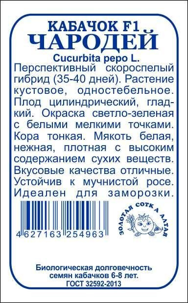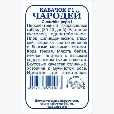 Перспективный скороспелый гибрид (35-40 дней). Растение кустовое, одностебельное. Плод цилиндрический, глад-кий. Окраска светло-зеленая с белыми мелкими точками. Кора тонкая. Мякоть белая, нежная, плотная с высоким содержанием сухих веществ. Вкусовые качества отличные. Устойчив к мучнистой росе. Идеален для заморозки.