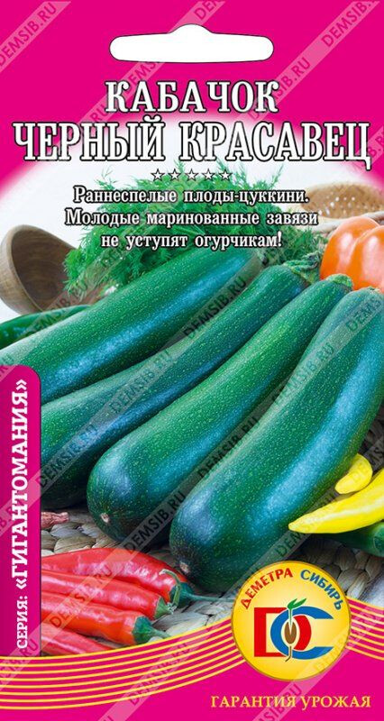 Высокоурожайный раннеспелый (50-55 дней) сорт. Растение кустовое. Плоды-цуккини цилиндрические, темно-зеленые без пятнистости, гладкие, с тонкой кожурой, массой 1- 2 кг. Мякоть светлая, очень сочная, содержит много витаминов. Прекрасно подходит для приготовления различных блюд и консервирования, отлично хранится и транспортируется.