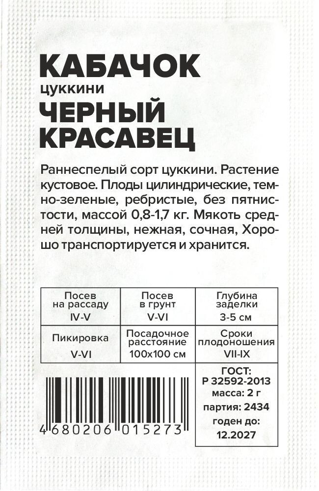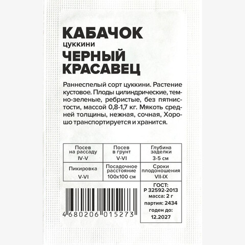Раннеспелый сорт цуккини. Растение кустовое. Плоды цилиндрические, темно-зеленые, ребристые, без пятнистости, массой 0,8-1,7 кг. Мякоть средней толщины, нежная, сочная, Хорошо транспортируется и хранится. Место посадки: легкие плодородные нейтральные почвы. Лучшими предшественниками являются крестоцветные (разные виды капусты), пасленовые Освещение: освещенные участки, хорошо переносят затенение Предпосевная подготовка: не требуется. Для улучшения всхожести выбирают семена возрастом 3-5 лет, замачивают в 1% растворе марганцовки на 15 минут Сроки посева: при прогревании почвы до 12-15°C. Растение не переносит заморозков Посев на рассаду: для получения ранней продукции кабачки сеют на рассаду поздней весной, за две-три недели до высадки. Посев в грунт: посев проводят, когда почва прогреется до 10-12°C (апрель-июнь). В лунку насыпают перегной, который немного присыпают землей, укладывают 2-3 семени и засыпают торфоземляной смесью. Схема посадки 100х100 см, глубина заделки семян 3-5 см. При раннем посеве в открытый грунт необходимо временное укрытие пленкой Пикировка/перевалка: рассаду закаливают, высадку проводят при среднесуточной температуре не ниже 15°C. Растения высаживают без повреждения земляного кома на высоту корневой шейки, без заглубления. Первые 3-5 дней притеняют Уход: для получения наиболее высокого урожая рекомендуется регулярно проводить рыхление почвы и умеренные поливы. В период цветения-налива плодов рекомендуется провести подкормку комплексными минеральными удобрениями. Не требует формировки Сбор урожая: проводится выборочно, по мере достижения плодами технической зрелости