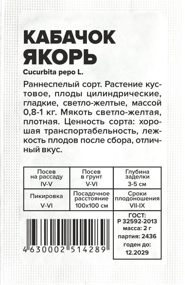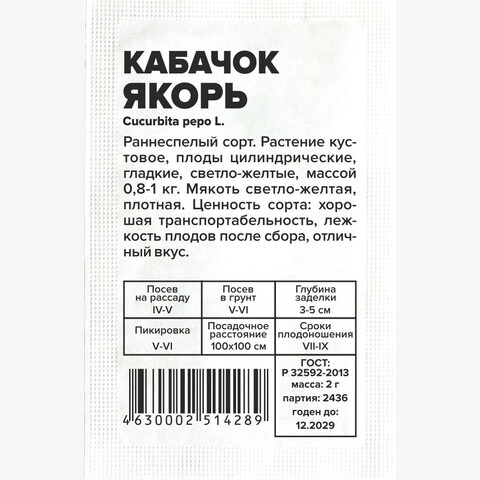 Раннеспелый сорт. Растение кустовое, плоды цилиндрические, гладкие, светло-желтые, массой 0,8-1 кг. Мякоть светло-желтая, плотная. Ценность сорта: хорошая транспортабельность, лежкость плодов после сбора, отличный вкус. Место посадки: легкие плодородные нейтральные почвы. Лучшими предшественниками являются крестоцветные (разные виды капусты), пасленовые Освещение: освещенные участки, хорошо переносят затенение Предпосевная подготовка: не требуется. Для улучшения всхожести выбирают семена возрастом 3-5 лет, замачивают в 1% растворе марганцовки на 15 минут Сроки посева: при прогревании почвы до 12-15°C. Растение не переносит заморозков Посев на рассаду: для получения ранней продукции кабачки сеют на рассаду поздней весной, за две-три недели до высадки. Посев в грунт: посев проводят, когда почва прогреется до 10-12°C (апрель-июнь). В лунку насыпают перегной, который немного присыпают землей, укладывают 2-3 семени и засыпают торфоземляной смесью. Схема посадки 100х100 см, глубина заделки семян 3-5 см. При раннем посеве в открытый грунт необходимо временное укрытие пленкой Пикировка/перевалка: рассаду закаливают, высадку проводят при среднесуточной температуре не ниже 15°C. Растения высаживают без повреждения земляного кома на высоту корневой шейки, без заглубления. Первые 3-5 дней притеняют Уход: для получения наиболее высокого урожая рекомендуется регулярно проводить рыхление почвы и умеренные поливы. В период цветения-налива плодов рекомендуется провести подкормку комплексными минеральными удобрениями. Не требует формировки Сбор урожая: проводится выборочно, по мере достижения плодами технической зрелости