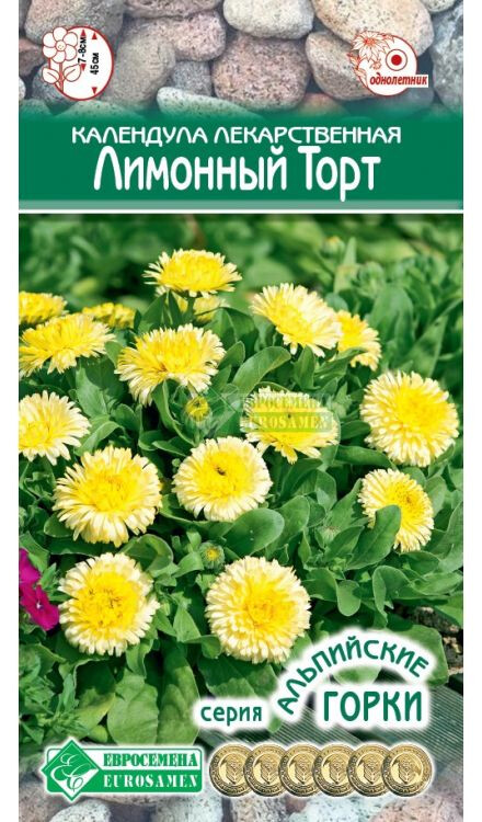 Календула – одно из самых неприхотливых и, в то же время, самых эффектных однолетних садовых растений. В средние века ее считали панацеей. В XII веке Мейсер в своем гербарии отметил, что даже обычное рассматривание золотистых цветков календулы улучшает зрение, очищает ум и создает прекрасное настроение. Отлично выглядит в больших массивах, бордюрах и в букетах. Соцветия – круглые корзинки, махровые, самой разнообразной окраски. Календула является ценным лекарственным растением, применяется в медицине как потогонное средство, а также для лечения ожогов и заживления ран. Лимонный Торт- среднего роста календула с уникальной формой махрового цветка лимонного цвета, которая не оставит никого равнодушным. Идеально подходит для выращивания в групповых посадках, рабатках, бордюрах и для лекарственных садиков. Отличается обильным и продолжительным цветением с начала лета до середины осени. Зацветает через 60-70 дней от времени посева.