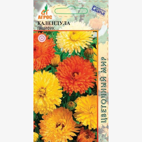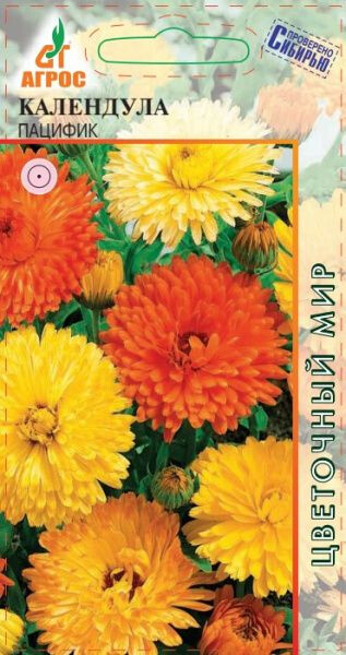 Растение однолетнее, серия Пацифик, соцветия-корзинки махровые, черепитчатые, диаметром 7-9 см, разнообразных оттенков. Во всех частях растения содержатся вещества, обладающие лечебными свойствами. Календула – растение крайне неприхотливое в культуре. Холодостойко, светолюбиво, хорошо развивается на разных типах почв. В сухую жаркую погоду соцветия мельчают, поэтому необходимо поливать и раз в две недели подкармливать. Семена высевают сразу в открытый грунт, а также под зиму. Всходы появляются через 10-14 дней. Используется в балконных ящиках, на срезку, для групп, рабаток, бордюров, где она сочетается с агератумом, сальвией, дельфиниумом, рудбекиями, цинниями и как овощное растение. 60 - V-VII, IX - 15x20 VI-IX