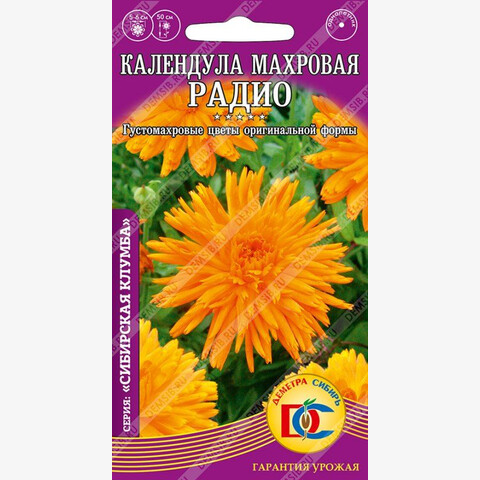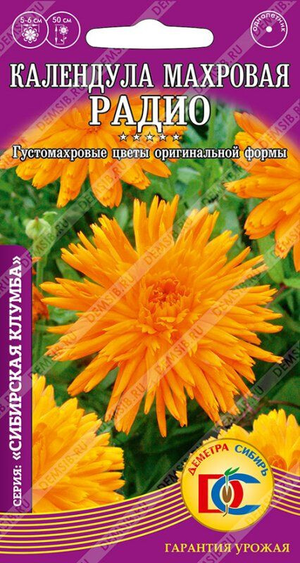Крупные полушаровидные махровые соцветия имеют оригинальную лучистую форму: яркие желто-оранжевые язычковые цветки, диаметром 5-6см, закручены в трубочки и образуют своеобразные “антенны”. Компактные кустики, высотой до 50 см, покрыты светло-зелеными листьями. Календула неприхотлива, отличается обильным и длительным цветением, великолепно подходит для посадки в группах, рабатках, хорошо смотрится в балконных ящиках. Обладает лекарствен-ными свойствами, а сушеные лепестки используют для приготовления чайных смесей.