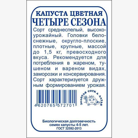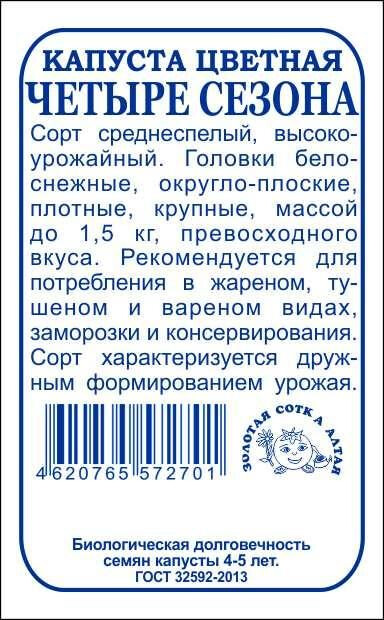 Сорт среднеспелый, высокоурожайный. Головки белоснежные, округло-плоские, плотные, крупные, массой до 1,5 кг, превосходного вкуса. Рекомендуется для потребления в жареном, тушеном и вареном видах, заморозки и консервирования. Сорт характеризуется дружным формированием урожая.