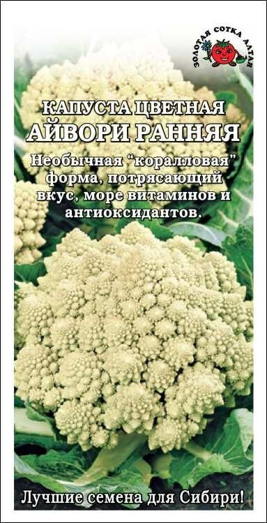 Цветная коралловая капуста, тип Романеско. Великолепный высокоурожайный сорт раннего срока созревания. Головки красивого цвета слоновой кости, очень плотные, массой 1,6-1,8 кг, по форме и строению напоминающие причудливые кораллы. Сорт используется в кулинарии, для заморозки и консервирования. Ценится за великолепные вкусовые качества, высокое содержание витаминов и антиоксидантов, а также за интересный внешний вид.