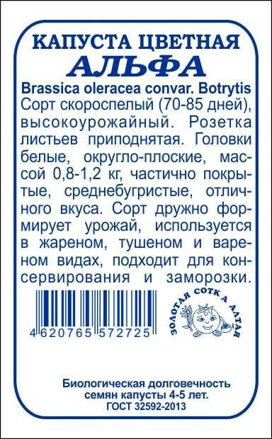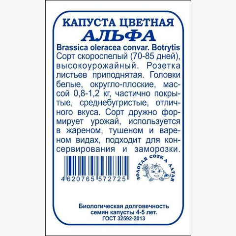 Сорт скороспелый, высокоурожайный. От всходов до хозяйственной годности 70-85 дней. Розетка листьев приподнятая. Головки округло-плоской формы, частично покрытые, средне бугристые, белого цвета, массой 0,8-1,2 кг, отличных вкусовых качеств. Сорт дружно формирует урожай, рекомендуется для потребления в жареном, тушеном и вареном видах, подходит для консервирования и замораживания.