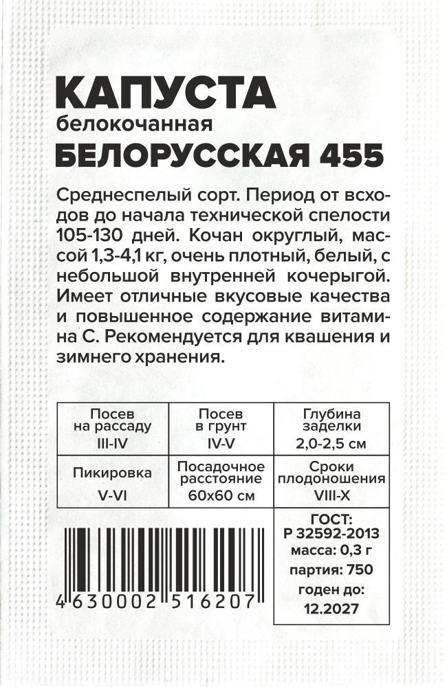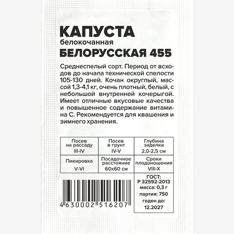 Среднеспелый сорт. Период от всходов до начала технической спелости 105-130 дней. Кочан округлый, массой 1,3-4,1 кг, очень плотный, белый, с небольшой внутренней кочерыгой. Имеет отличные вкусовые качества и повышенное содержание витамина С. Рекомендуется для квашения и зимнего хранения. Место посадки: плодородные рыхлые почвы с нейтральной реакцией среды. Лучшие предшественники — бобовые, тыквенные, картофель, морковь, лук Освещение: обильное, не выносит затенения Предпосевная подготовка: семена замачивают в 0,5% растворе марганцовки на 15 минут. Для стимулирования прорастания замачивают на 20 минут в воде 45°С. Инкрустированные (цветные) семена сеют сухим способом, без замачивания и подготовки Сроки посева: на рассаду высевают за 45-55 дней до высадки (март-апрель), в открытый грунт после схода снега и прогревания почвы до 5-8°С (апрель-май) Посев на рассаду: семена размещают на уплотненном питательном грунте, присыпают слоем земли 2-2,5 см и хорошо уплотняют, обильно поливают теплой водой и накрывают пленкой. До появления всходов размещают в теплом месте +22-25°С. При появлении всходов рекомендовано снизить температуру до +13-15°С днем и +6-8°С ночью на 3-5 дней, для получения коренастых растений, затем снова перенести в теплое хорошо освещенное место. Посев в грунт: в зависимости от региона (апрель-июнь), на глубину 2,0-2,5 см по схеме 60х60 см Пикировка/перевалка: рассаду высаживают в возрасте 50-55 дней во влажную, удобренную почву. Посадочный интервал 60х60 см. После высадки растения притеняют первые 5-7 дней Уход: в течение всего сезона растениям необходимы регулярные обильные поливы, своевременные прополки, рыхление и подкормки азотными и калийными минеральными удобрениями. Хорошо отзывается на внесение микроудобрений, содержащих магний и бор