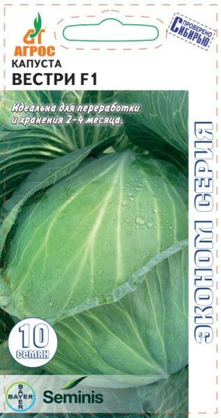 Cреднеранний гибрид с компактной розеткой листьев. Светло-зеленые, округлые кочаны отличной структуры достигают массы 4,0-8,0 кг. ВЕСТРИ F1 отличается универсальностью использования: она хороша для приготовления свежих салатов, для квашения, но еще и хранится в свежем виде в течение 2-4-х месяцев. Особенности выращивания: при высадке растения заглубляются до 1-го настоящего листа. - IV - V 45x70 VII-IX