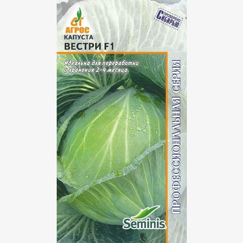 Cреднеранний гибрид с компактной розеткой листьев. Светло-зеленые, округлые кочаны отличной структуры достигают массы 4,0-8,0 кг. ВЕСТРИ F1 отличается универсальностью использования: она хороша для приготовления свежих салатов, для квашения, но еще и хранится в свежем виде в течение 2-4-х месяцев.
