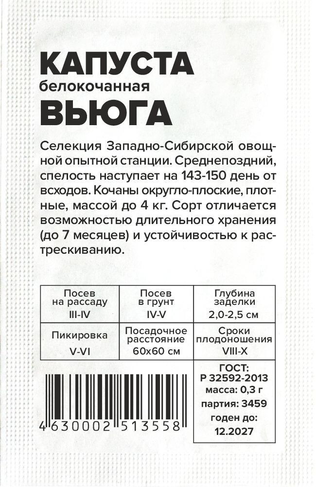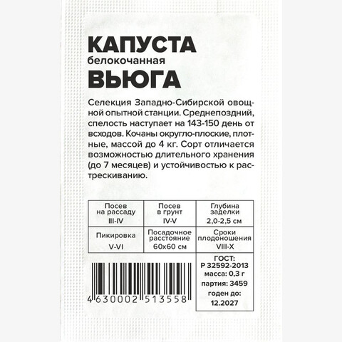 Капуста Вьюга/Сем Алт/бп 0,3 гр. Сибирская Селекция!