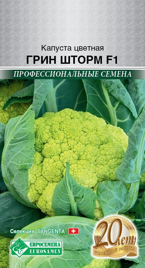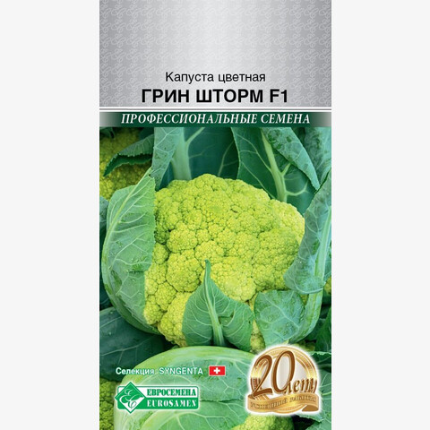 Цветная капуста – невероятно полезный и вкусный овощ, содержит больше полезных веществ, чем любой другой вид капусты. Её родной дом – Средиземноморье, а культивируется она почти во всём мире. Почему капусту назвали цветной и как она еще называется? Цветной она называется потому, что её головка (кочан) представляет собой большое соцветие, которое состоит из нескольких тысяч цветоносных побегов, прижатых друг к другу. Грин Шторм –раннеспелый гибрид цветной капусты, с момента высадки 30-дневной рассады до сбора урожая проходит 65-75 дней. Листья темно-зеленые, с сизоватым оттенком, прикрывают головку. Соцветия плотные, однородные, зеленовато-желтого цвета, массой до 1,5-2,0 кг. Вкусовые качества головок отличные. Гибрид рекомендуется для свежего потребления, заморозки и разного рода переработок. Плотность посадки — 3-4 растения/м². Урожайность — 5,0-7,5 кг/м².