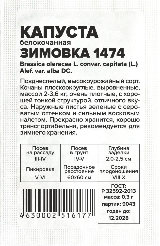 Позднеспелый, высокоурожайный сорт. Кочаны плоскоокруглые, выровненные, массой 2-3,6 кг, очень плотные, с хорошей тонкой структурой, отличного вкуса. Наружные листья зеленые c сероватым оттенком и сильным восковым налетом. Прекрасно хранится, хорошо транспортабельна, рекомендуется для зимнего хранения. Место посадки: плодородные рыхлые почвы с нейтральной реакцией среды. Лучшие предшественники — бобовые, тыквенные, картофель, морковь, лук Освещение: обильное, не выносит затенения Предпосевная подготовка: семена замачивают в 0,5% растворе марганцовки на 15 минут. Для стимулирования прорастания замачивают на 20 минут в воде 45°С. Инкрустированные (цветные) семена сеют сухим способом, без замачивания и подготовки Сроки посева: на рассаду высевают за 45-55 дней до высадки (март-апрель), в открытый грунт после схода снега и прогревания почвы до 5-8°С (апрель-май) Посев на рассаду: семена размещают на уплотненном питательном грунте, присыпают слоем земли 2-2,5 см и хорошо уплотняют, обильно поливают теплой водой и накрывают пленкой. До появления всходов размещают в теплом месте +22-25°С. При появлении всходов рекомендовано снизить температуру до +13-15°С днем и +6-8°С ночью на 3-5 дней, для получения коренастых растений, затем снова перенести в теплое хорошо освещенное место. Посев в грунт: в зависимости от региона (апрель-июнь), на глубину 2,0-2,5 см по схеме 60х60 см Пикировка/перевалка: рассаду высаживают в возрасте 50-55 дней во влажную, удобренную почву. Посадочный интервал 60х60 см. После высадки растения притеняют первые 5-7 дней Уход: в течение всего сезона растениям необходимы регулярные обильные поливы, своевременные прополки, рыхление и подкормки азотными и калийными минеральными удобрениями. Хорошо отзывается на внесение микроудобрений, содержащих магний и бор